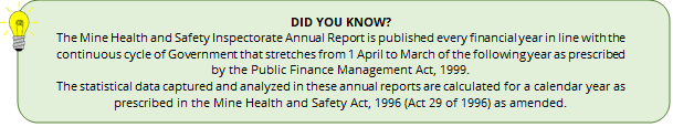 The Mine Health and Safety Inspectorate Annual Report is a document by the Chief Inspector of Mines. It contains information on health and safety at mines as well as the activities of the Mine Health and Safety Inspectorate, compiled as required by Section 49(I)(j) of the Mine Health and Safety Act, 1996 (Act 29 of 1996) as amended.