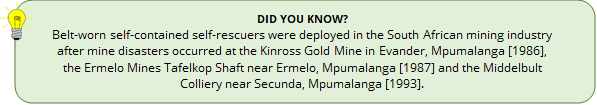 The Mine Health and Safety Inspectorate developed a guideline for the South African mining industry to manage all aspects associated with the deployment of self-contained self-rescuers. Further to this guideline, the South African mining industry are guided by the Download resources as well as Download resources and Download resources of the Mine Health and Safety Inspectorate.