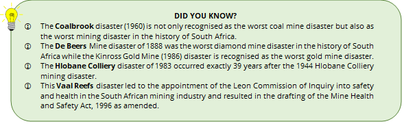 The South African mining industry has been plagued by challenges of fatalities and injuries resulting from mining activities for more than a century. During the 1980s more disasters occurred than in any other decade in the history of mining in South Africa.