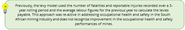 The revised levy model has a balanced approach and aims to be pro-active with reference to occupational health and safety interventions to mitigate accidents and dangerous occurrences at mines in South Africa.